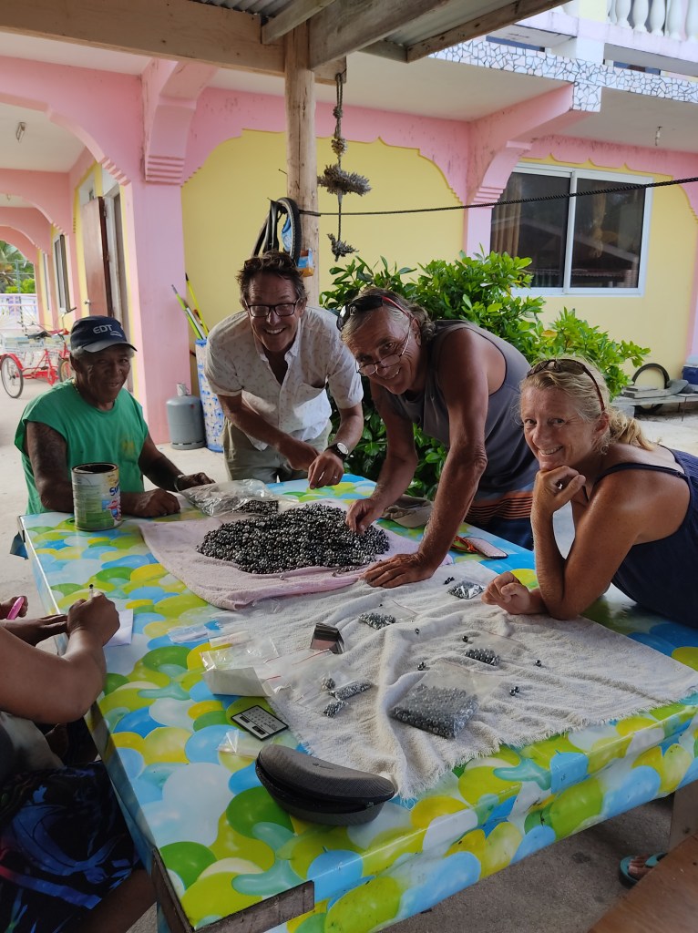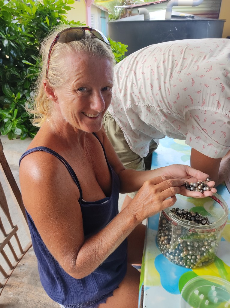 En ettermiddag gikk vi og Jenevora og Fergus fra 2 Drifters «tilfeldigvis» forbi huset til en av perle-farmerene på øya. Han var ute, og da vi spurte om han ville selge oss perler var det ikke nei i hans munn. De har dårlige tider nå, med lite turister og liten etterspørsel etter perlene sine. Så vi ble invitert inn og fikk gå gjennom det han hadde av såkalte fine perler. De sorte Tahiti perlene kategoriseres etter spesielle kriterier og prisen settes etter hvor perfekte de er. Vi valgte ut 8-9 «midt-på-treet» perler hver, og så spurte vi om han hadde perler som ikke egnet seg for salg. Vi vet at det er flere perler som forkastes enn det som godkjennes, og perlene som forkastes skal egentlig ikke selges. Men han kom trekkende med en stor pose med flotte, artige perler og det var dette vi egentlig ville ha. Så vi satt lenge og plukket og kikket, og da vi endelig var ferdige betalte vi ca 1000 kroner hver og var riktig så fornøyde. (vi kjøpte 8 fine og 52 ikke fine perler)