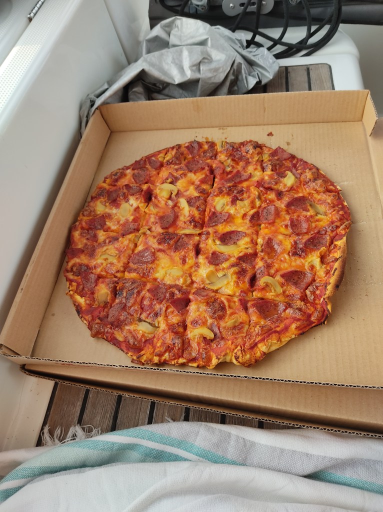 I tre dager lå vi på anker og ventet på å få komme til land. Myndighetene var stadig utenom i båt, de ville se papirer, ta covid-test, hente søppel og gå gjennom all mat om bord. Det er strenge krav til hva du kan ha med av mat, og alt av frisk frukt- og grønnsaker og alt av svinekjøtt, hermetisk og frosset også, blir konfiskert. Gleden var stor da de kom med to pepperoni-pizzaer til oss, vi var ganske lei av maten vi hadde ombord.