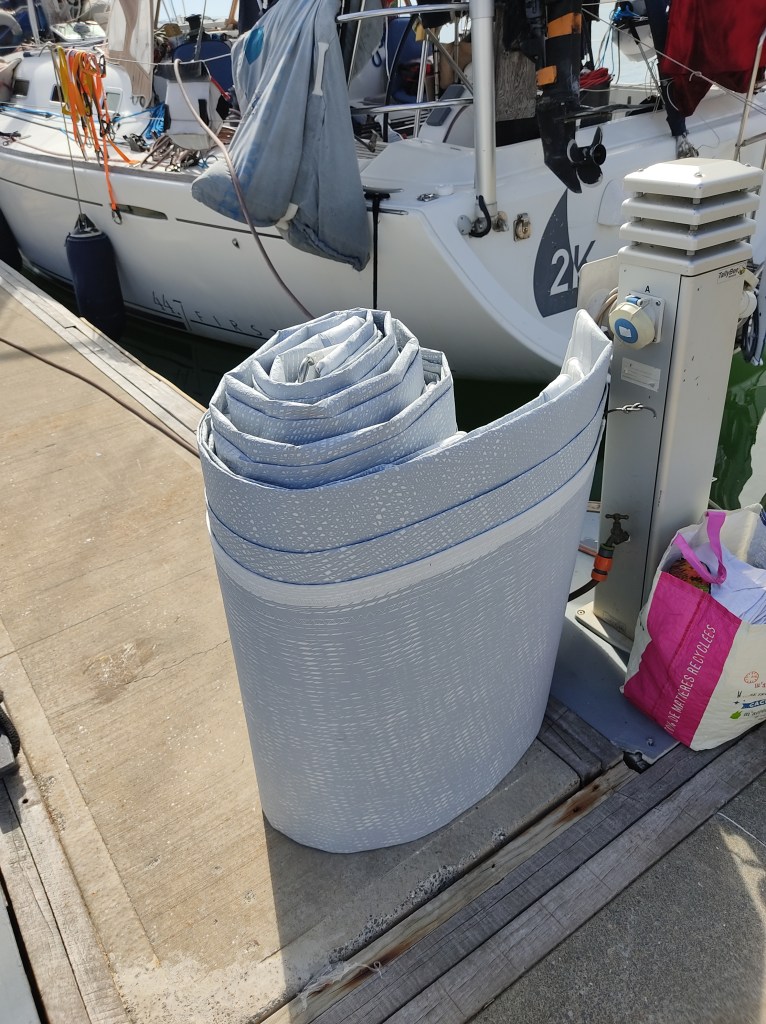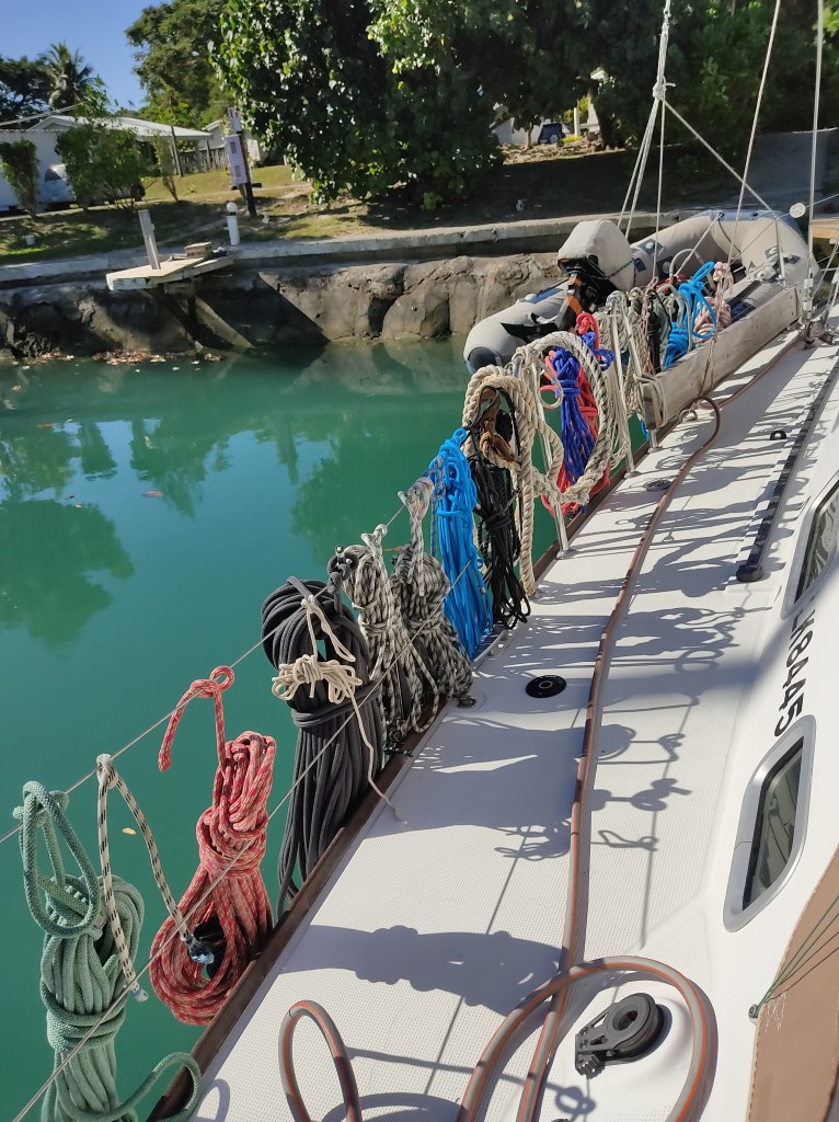 Endelig kom vi inn i marinaen og kunne gå på land. Vi fikk handlet litt ny mat og vasket flere maskiner med klær, fikk kjøpt middag på restaurant (men ikke spise den der – stengt pga covid), og vi møtte på Rob fra Ventana som vi hadde vært sammen med i Fransk Polynesia. Høydepunktet var da vårt nye storseil kom fra New Zealand og ble levert på bryggen! Vi kunne ikke vente med å komme oss ut på sjøen igjen og teste det. Den gamle «filla» ga vi bort til en liten landsby ute på en av øyene, og de skulle bruke det til solbeskyttelse.