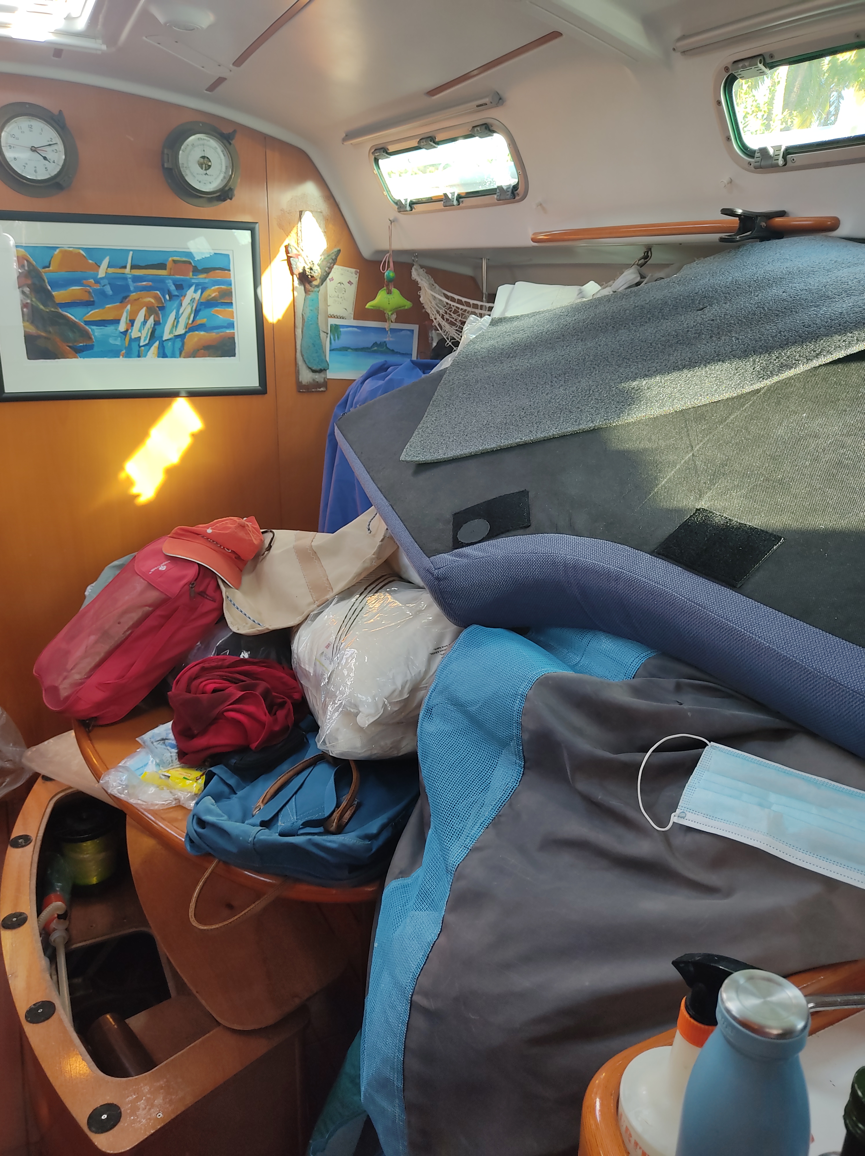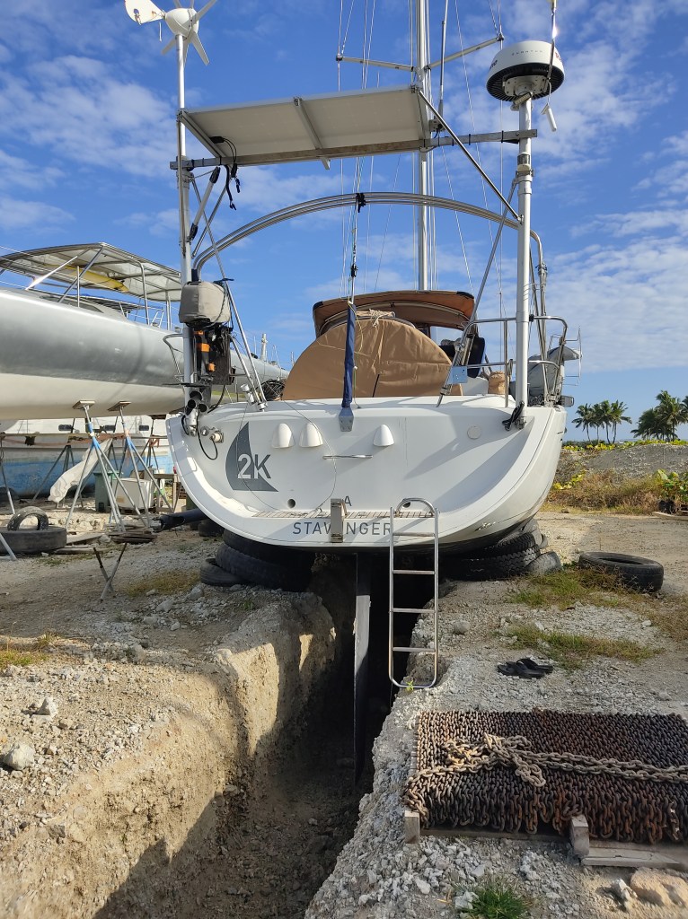 Da det var i boks var det bare å avtale opptak av båten og sette i gang med arbeidet. Båten skulle på land, kjølen skulle graves ned i sanden og alt utvendig som seil, tauer, bimini og sprayhood må pakkes inn i båten. Innvendig skulle hele båten vaskes med eddik, alle klær pakkes i vakuum-poser, all mat som ikke er hermetikk blir gitt bort pluss titusen små ting som måtte ordnes. Men vi var klar for jobben og for å fly hjem til Norge.