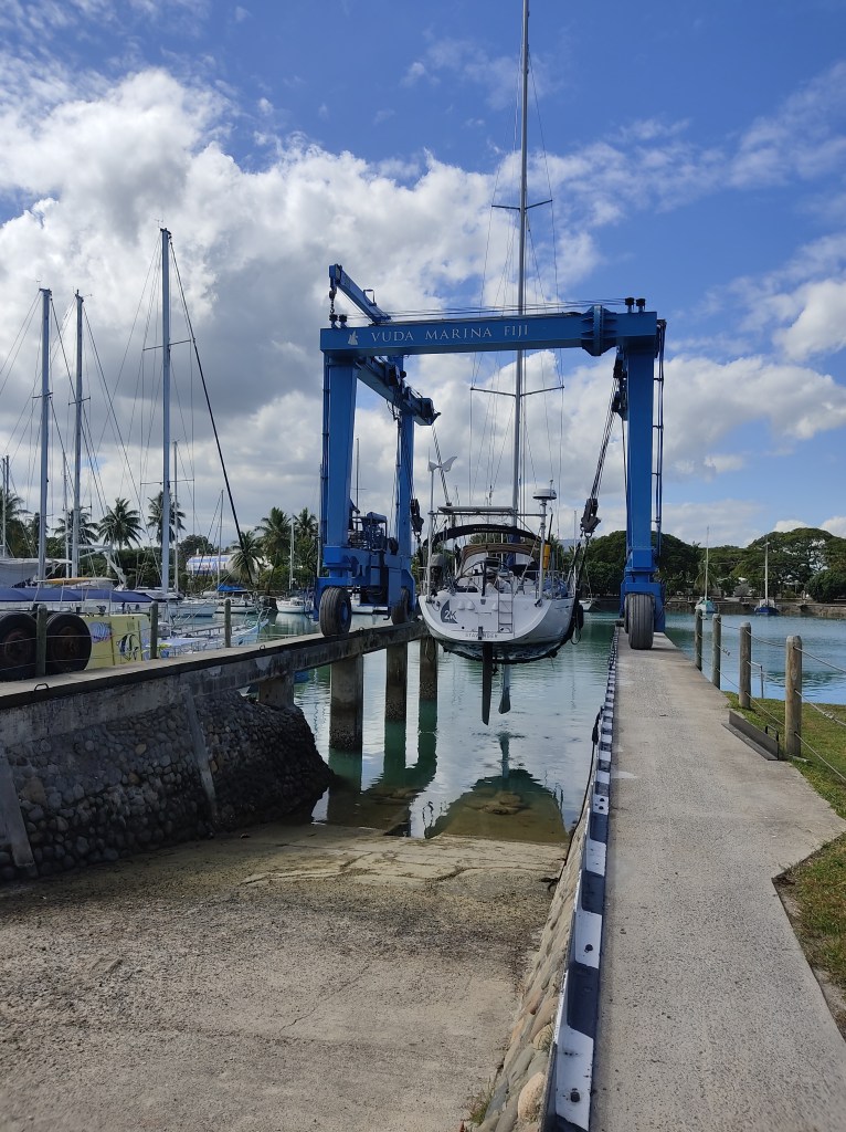 Vuda Marina was an incredibly beautiful place and we felt welcome and well taken care of from the first moment. The staff greeted us with a welcome song (in Fiji) and a flower crown for the boat, and we received all possible help the week we were there. When the boat went ashore, we moved into one of their rental cabins so we did not have to live in the chaos of the boat.