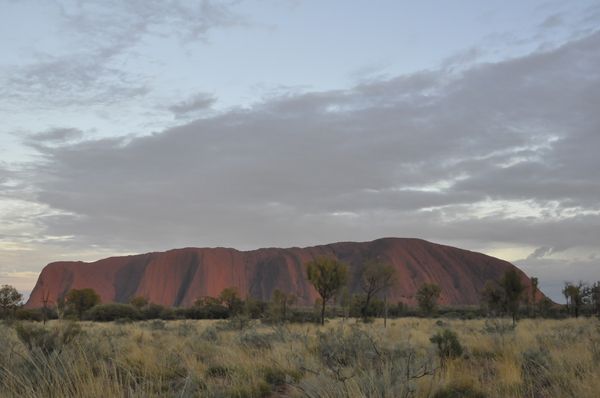 We stop at the coach car park besides Uluru to see the golden color at sunrise, but when the sun rises it is partly cloudy and you have to watch carefully every time the sun breaks through the clouds.